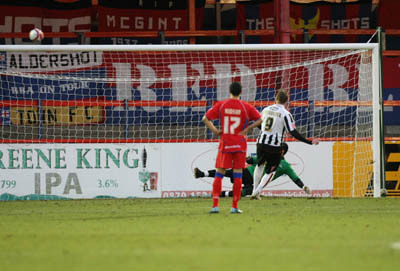 Adam Proudlock scoops his penalty over the crossbar as Grimsby Town draw 1-1 at Aldershot on 30th January 2010.
